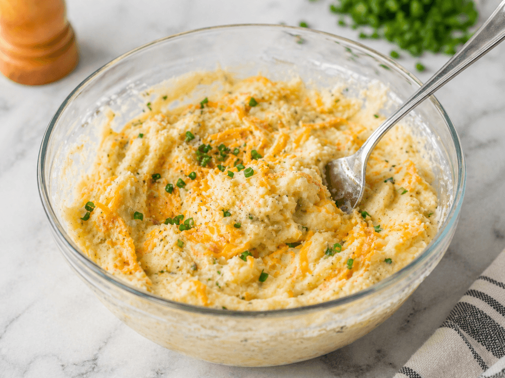 In a large bowl, combine cold mashed potatoes, egg, cheddar cheese, mozzarella cheese, flour, chives, garlic powder, paprika, black pepper, and salt.