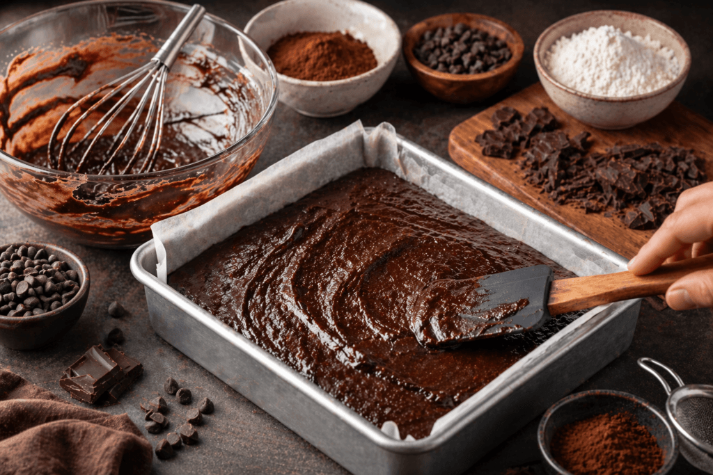 1. Prep the pan: Heat your oven to 350°F. Grease a 9×13 inch baking pan and line it with parchment paper leaving some overhang on the sides so you can lift the whole slab out cleanly after baking. This is not optional — trying to cut brownies in a pan without parchment is a frustrating experience that results in broken pieces and a pan that is very difficult to clean.