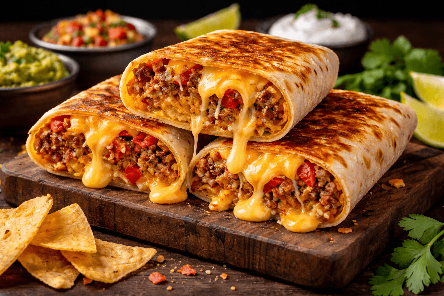 I need to talk about the grilled cheese burrito because I genuinely think it does not get enough credit. A regular burrito is great. A great burrito is even better. But a grilled cheese burrito — where you press the whole thing onto a layer of melting cheddar in a hot pan until the outside gets this insane crispy golden cheese crust — that is something else entirely. That is a whole different conversation. I made my first one completely by accident. I had leftover seasoned beef in the fridge, some rice, a can of black beans and a block of cheddar that needed to be used up. I rolled everything into a tortilla and then instead of just eating it I thought — what if I put cheese directly on the pan first and then put the burrito on top of it. What if the outside of this burrito was basically a grilled cheese. So I tried it. And I stood at my kitchen counter eating it before I had even sat down because I could not wait. The outside was golden and crackly with this thin layer of crisped cheese that shattered slightly when I bit into it. The inside was warm and melted and everything was held together by strings of gooey mozzarella. My family walked in while I was still standing there and I had to make three more immediately. This recipe is now something I make at least once a week and it takes about thirty minutes from start to finish. Once you try the cheese-on-the-outside method you will never make a burrito any other way again.